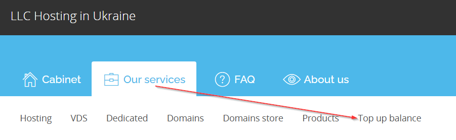 To top up your account balance in your Personal Account, select the section Our Services - Top Up Balance.