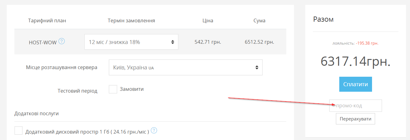 Промокод — це спеціальний код, який надає додаткову знижку або бонус під час замовлення послуги. Ви можете скористатися ним під час оформлення нового замовлення або продовження існуючої послуги.