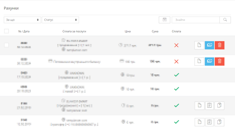 На сторінці відображатимуться усі рахунки, договори та акти, які можна завантажити. Для більшої зручності передбачені фільтри за типом, статусом та датою, а також текстовий пошук.